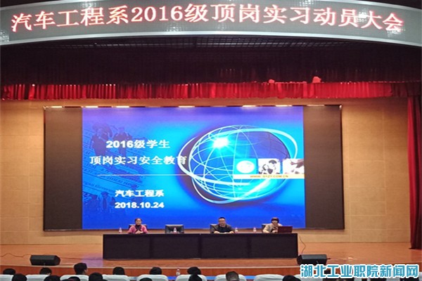 10月24日下午,汽车工程系在图书馆会议中心召开了2016级学生顶岗实习动员大会,汽车工程系主任张健党总支书记王俐凤副书记梁军萍以及16级辅导员和全体16级毕业生参加了此次会议。会上,张健就顶岗实习期间的具体工作和要求进行了全面的安排和部署,阐述了顶岗实习的重要意义,要求同学们人人参与实习、服从实习单位的管理、与辅导员和校内指导老师保持密切联系,勉励同学们发扬吃苦耐劳的精神,在实习岗位上积累知识放宽眼界通过顶岗实习这次预就业课程完成“破茧成蝶”的蜕变成为“会学习、会做人、会做事和有技能”的高素质人才,为今后的就业和职业发展打下良好的基础。党总支书记王俐凤顶岗实习期间同学们应该注意的安全问题做了详细的讲解,提醒同学们注意人身和财产安全,全体同学对实习安全有了进一步的认识。
