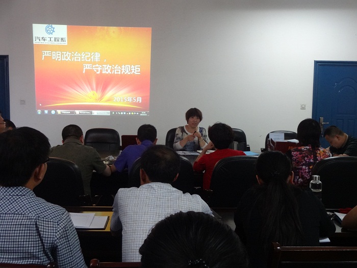 512日,为了深入学习贯彻党的十八大、十八届三中、四中全会精神和习近平总书记系列重要讲话精神,按照院党委的安排部署,汽车工程系组织开展以“严明政治纪律、严守政治规矩”为主题的集中教育活动。会议由系党总支书记王俐凤主持,全体教职工参加此次学习。