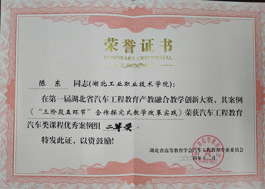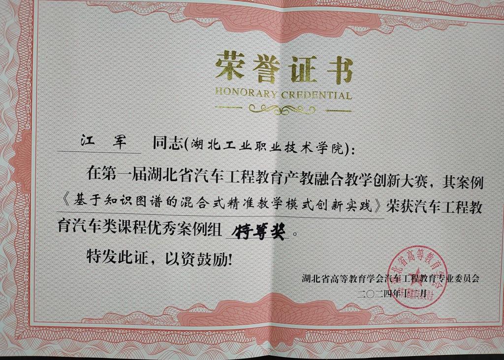 (通讯员张健)11月30日至12月1日,湖北省高等教育学会汽车工程教育专业委员会2024年年会在武汉理工大学举行,同期举办了首届湖北省汽车工程教育产教融合教学创新大赛,在大赛中,PP电子游戏官网PP电子游戏网站江军老师的《基于知识图谱的混合式精准教学模式创新实践》荣获汽车工程教育汽车类课程优秀案例特等奖,陈东老师的《“三阶段五环节”合作探究式教学改革实践》、赵锐老师的《追溯汽车之韵,传承文化之魂》荣获汽车工程教育汽车类课程优秀案例二等奖。