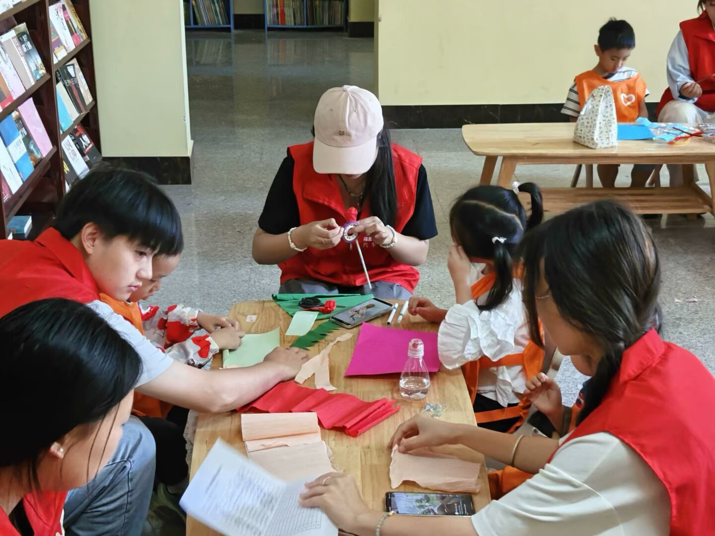 上午9时的手作现场,孩子们在志愿者的一声声“花瓣应该这样叠”、“贺卡这里要留白"的轻声指导下,将褶皱纸、扭扭棒等材料转变成立体贺卡、布艺花束等一件件精美的手工作品。家长们也呆在特别设置的“亲子协作区”,由旁观者转变为参与者,共同体验着温馨和谐的亲子关系。10时45分的献礼环节将活动推向高潮,孩子们手持康乃馨与自制礼物,用稚嫩童声诉说着“妈妈我爱你”。志愿服务队担任“时光照相师馆”,为每个家庭留下难忘的瞬间,实现感恩教育的延伸。