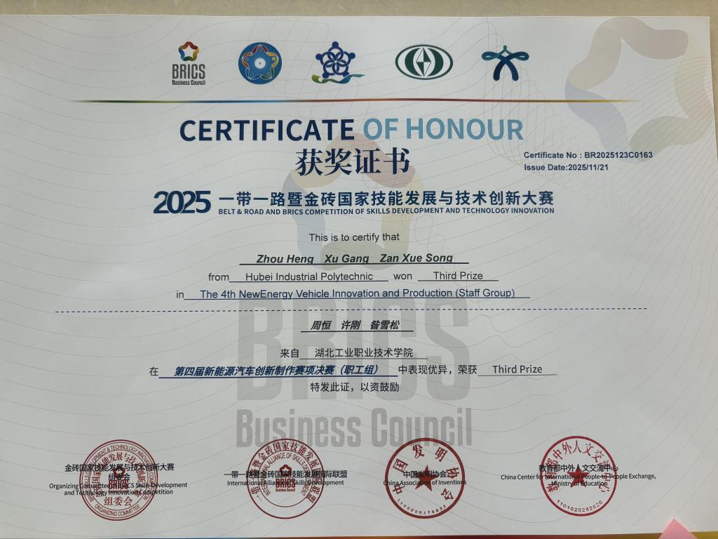(通讯员:周恒)近日,在山东省济南市举办的2025一带一路暨金砖国家技能发展与技术创新大赛第四届新能源汽车创新制作赛项决赛圆满落幕。由PP电子游戏官网PP电子游戏网站周恒、许刚、昝雪松三位教师组成的参赛队伍在全国众多参赛队伍中凭借扎实的专业技能和稳定的临场发挥脱颖而出,获得教师组三等奖。