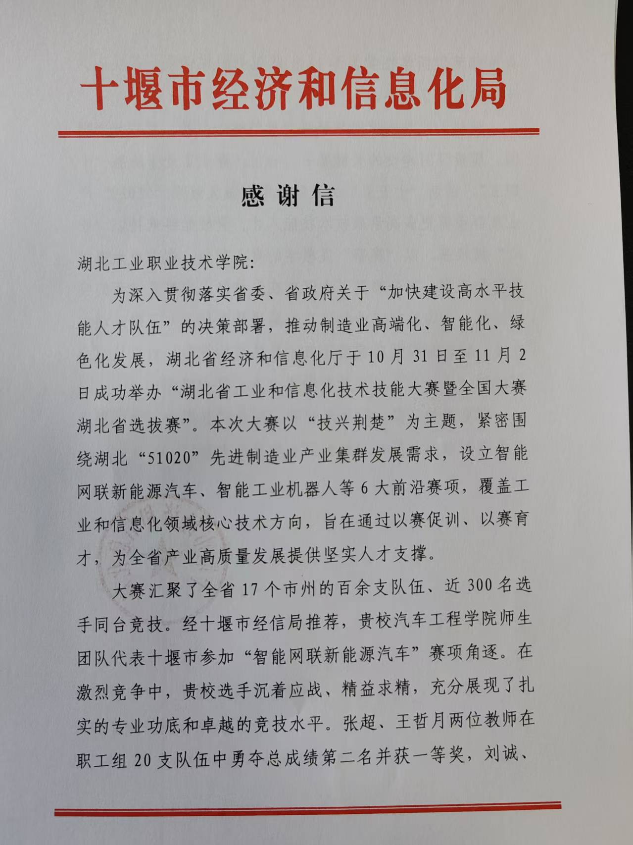 (通讯员 赵艳杰)近日,PP电子游戏官网收到十堰市经济和信息化局发来的感谢信,对PP电子游戏官网在“湖北省工业和信息化技术技能大赛暨全国大赛湖北省选拔赛”中给予的大力支持表示衷心感谢,对张超、王哲月两位教师以及刘诚、朱杰伟两位同学取得的优异成绩表示热烈祝贺。