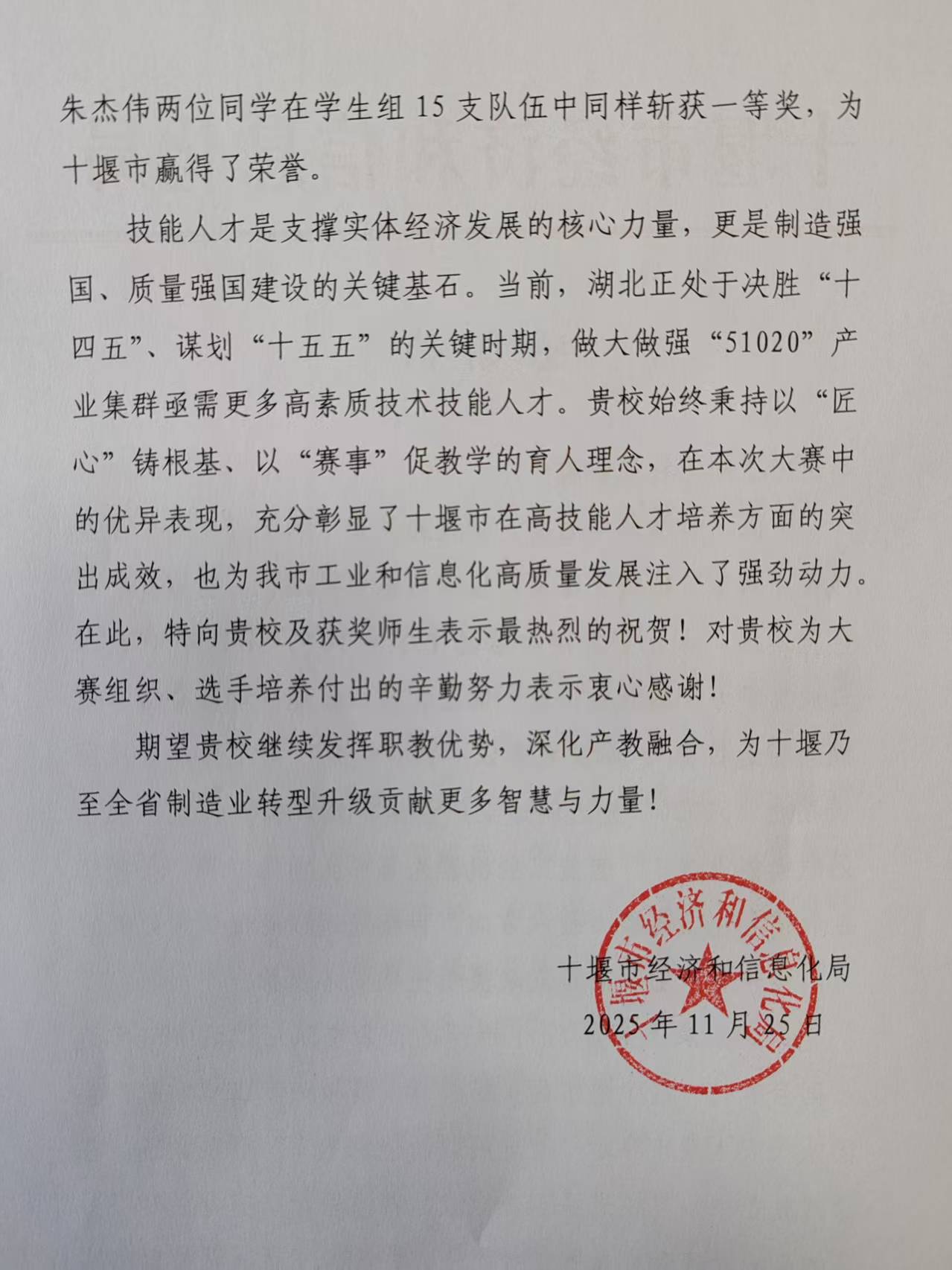 感谢信中指出,本次大赛以“技兴荆楚”为主题,紧密围绕湖北“51020”先进制造业产业集群发展需求,设立智能网联新能源汽车、智能工业机器人等6大前沿赛项。经十堰市经信局推荐,PP电子游戏官网PP电子游戏网站师生团队代表十堰市参加“智能网联新能源汽车”赛项角逐。张超、王哲月两位教师在职工组20支队伍中勇夺总成绩第二名并获一等奖,刘诚、朱杰伟两位同学在学生组15支队伍中同样斩获一等奖,充分展现了PP电子游戏官网师生扎实的专业功底和卓越的竞技水平,为十堰市赢得了荣誉。