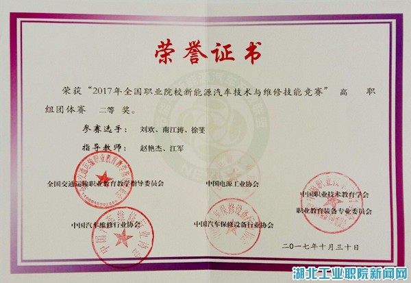 (通讯员 江军)近日,由全国交通运输职业教育教学指导委员会、汽车维修行业协会主办的“2017年全国职业院校新能源汽车技术与维修技能竞赛”在南京交通职业技术学院举行。大赛共有来自全国中、高职院校的51个代表队,共计254人参加。湖北工业职院代表队由汽车工程系赵艳杰、江军担任指导教师,新能源汽车技术专业学生刘欢、南江涛、徐斐参赛。最终,学院代表队喜获高职组团体二等奖的优异成绩。